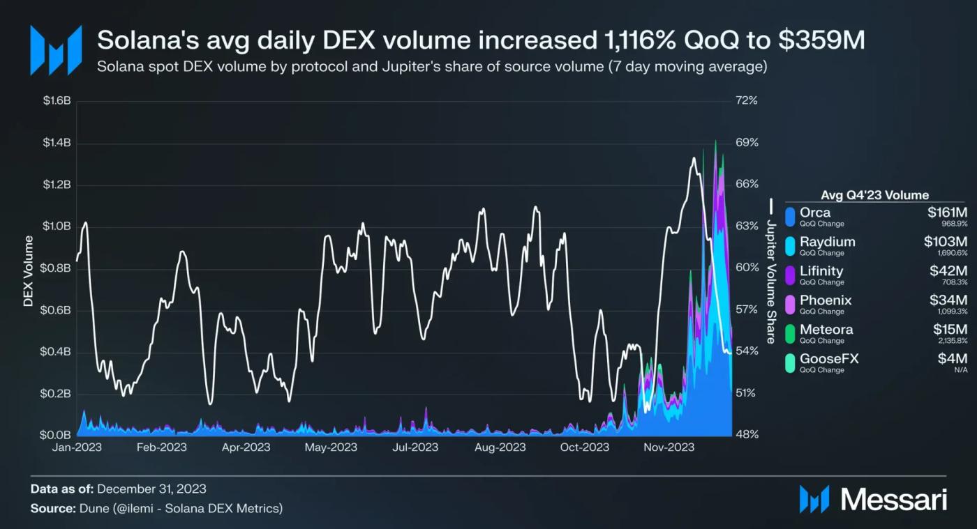 DeFi trading volume has also grown significantly, with the average daily spot DEX trading volume increasing by 1116% month-on-month to $359 million. Of the trading volume in Q4 2023, 45% used liquidity from Orca, followed by Raydium (29% market share). Orca and Raydium rank third and fifth in Solana TVL, with $190 million and $133 million respectively.