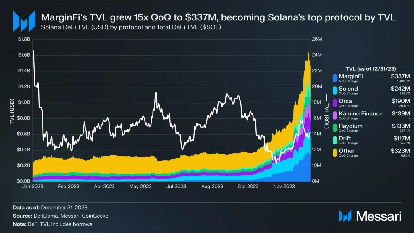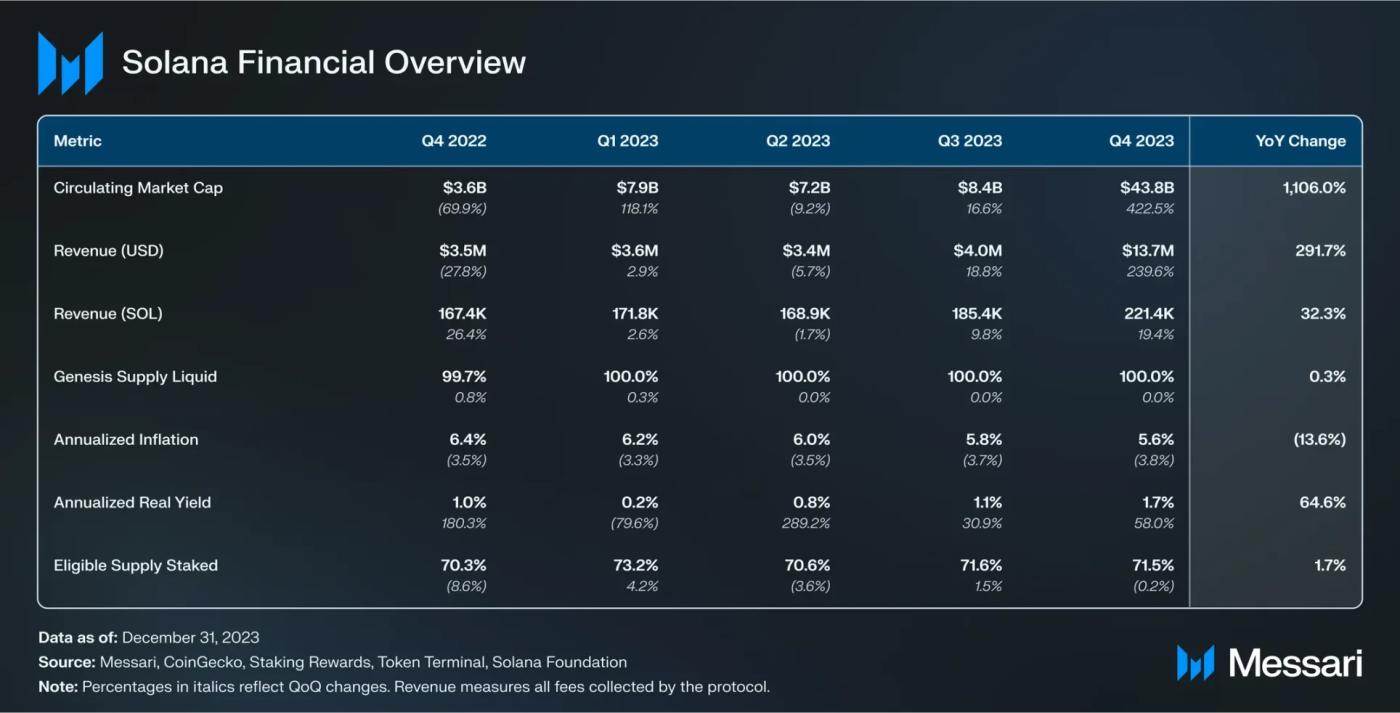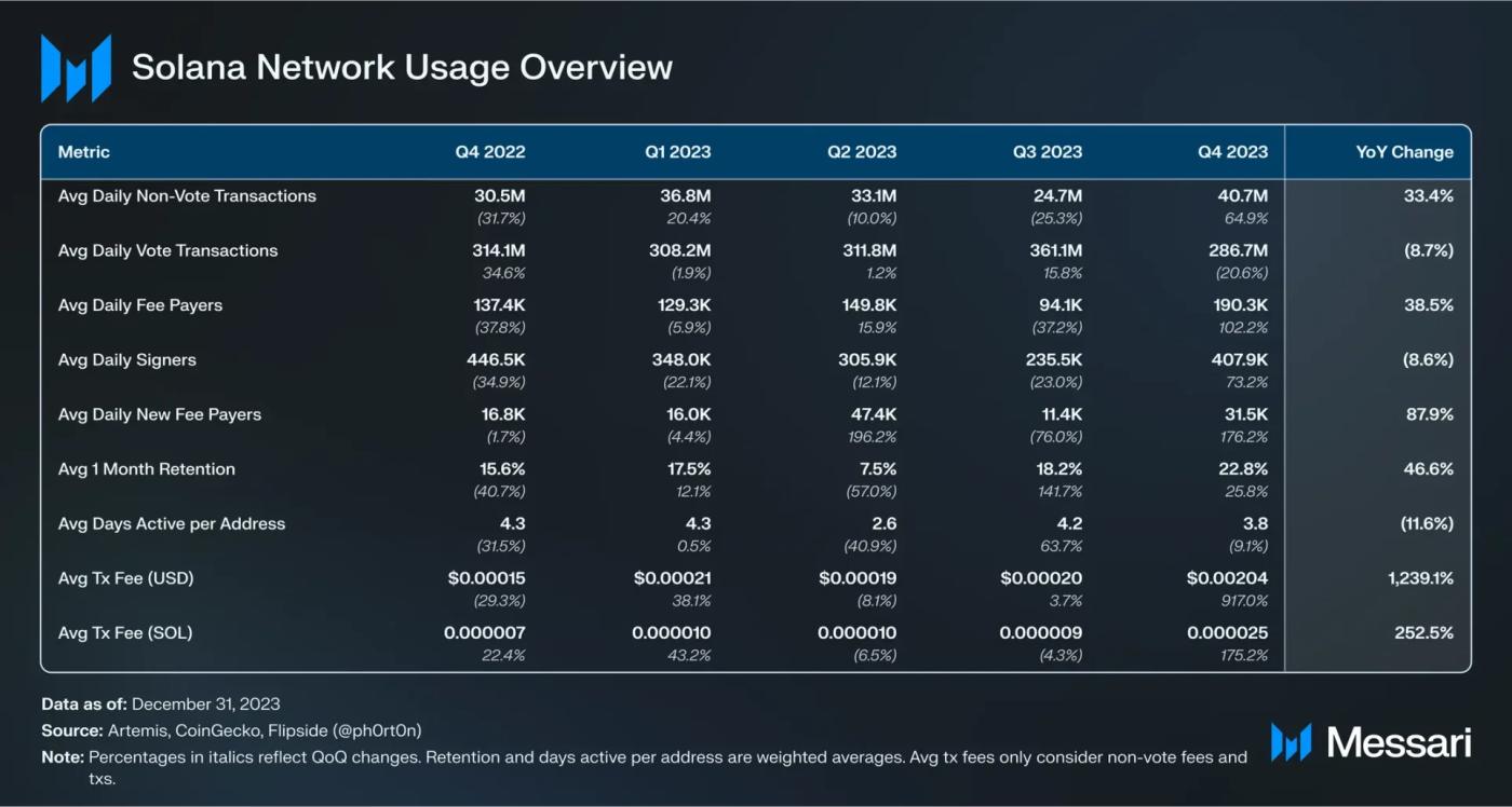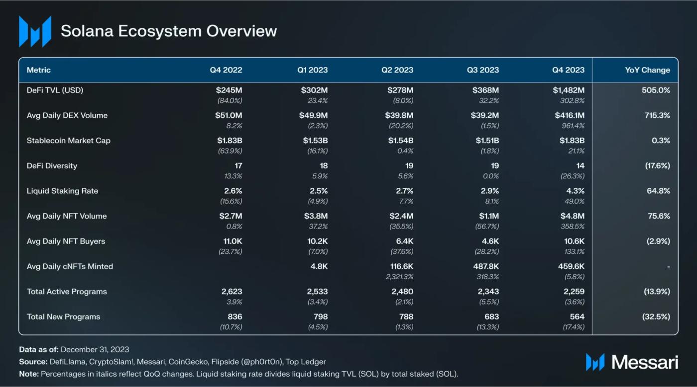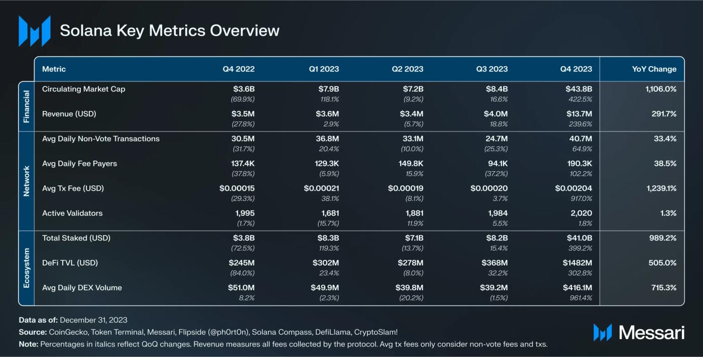 - Many of Solana's metrics maintained sequential growth in Q4 2023, including market capitalization (423%), average number of daily fee payers (102%), DeFi TVL (303%), average daily DEX trading volume (961% ) and average daily NFT trading volume (359%).