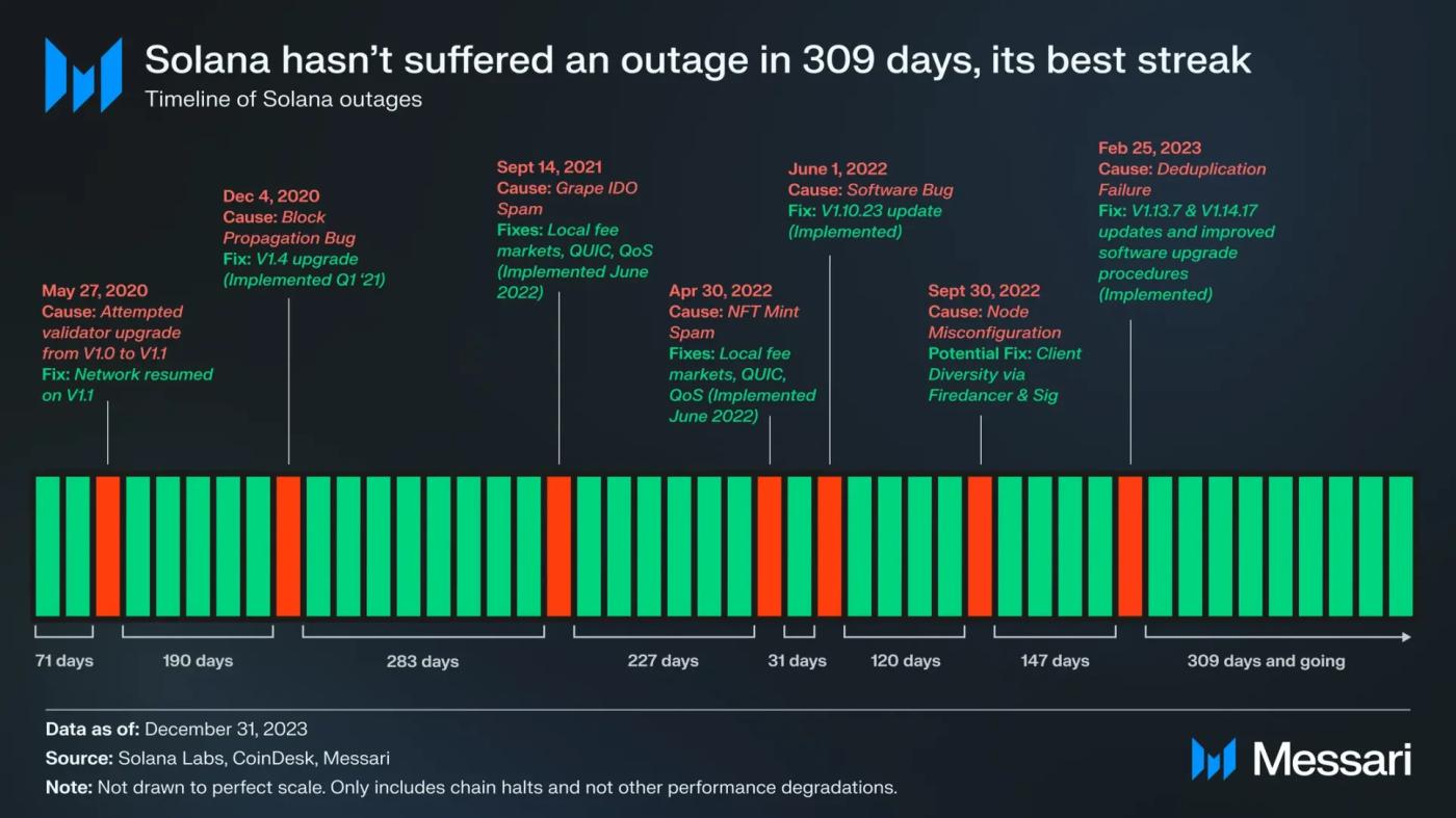 As of December 31, 2023, the Solana network was in the longest continuous state of no network outage, with a total duration of 309 days. This streak is the result of new technology features introduced over the past year, such as QUIC, stake-weighted QoS, and local fee markets, as well as improvements to the network upgrade process. While this doesn't mean Solana will never go down again, Developers deserve recognition for their successful work in improving widely criticized issues.