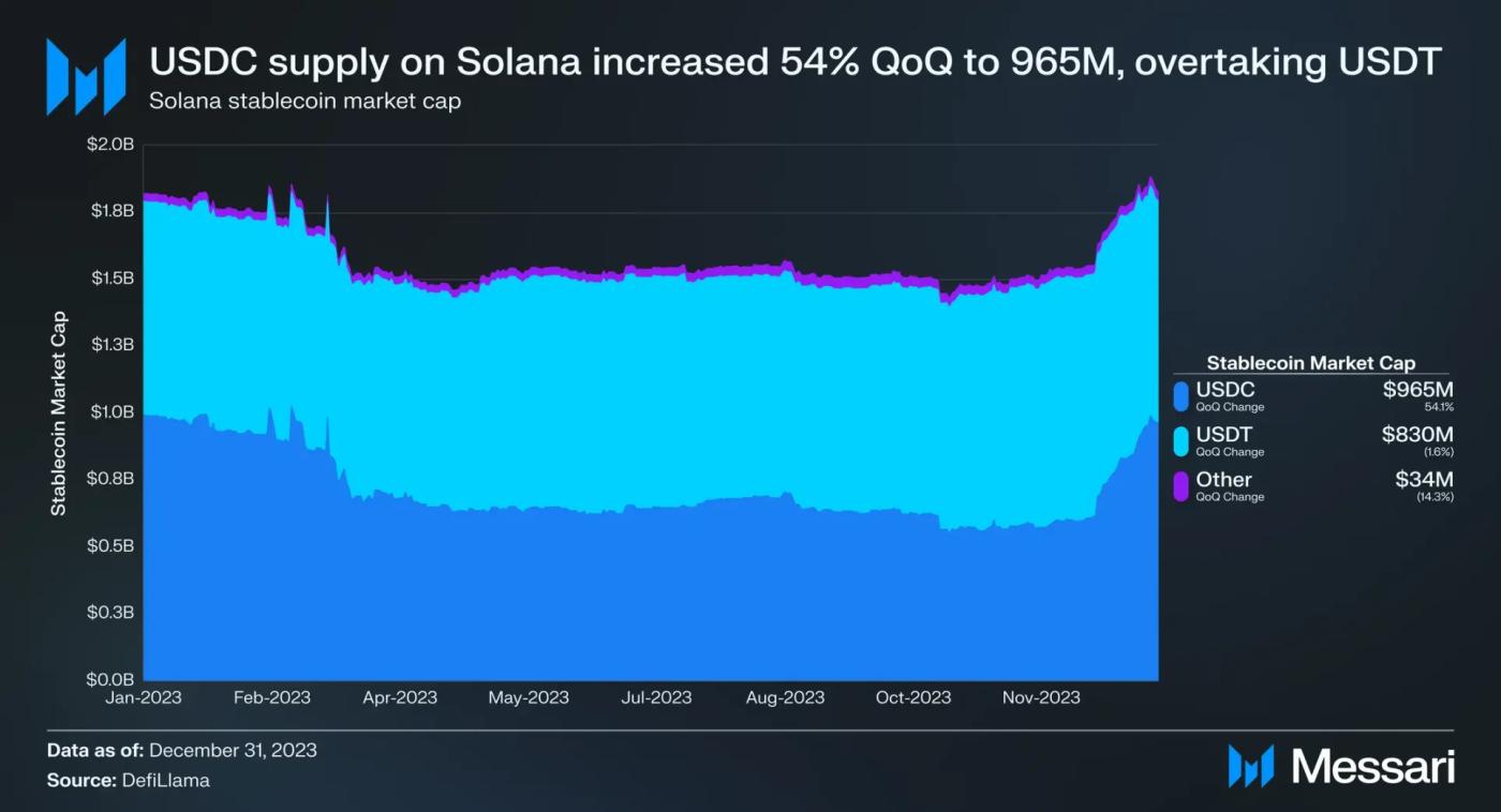 After being relatively flat for most of 2023, Solana's stablecoin market capitalization increased by more than $300 million month-on-month, mainly due to the increase in USDC supply in December 2023. USDC liquidity and interoperability on Solana should continue to grow through Circle’s Cross-Chain Transfer Protocol (CCTP).