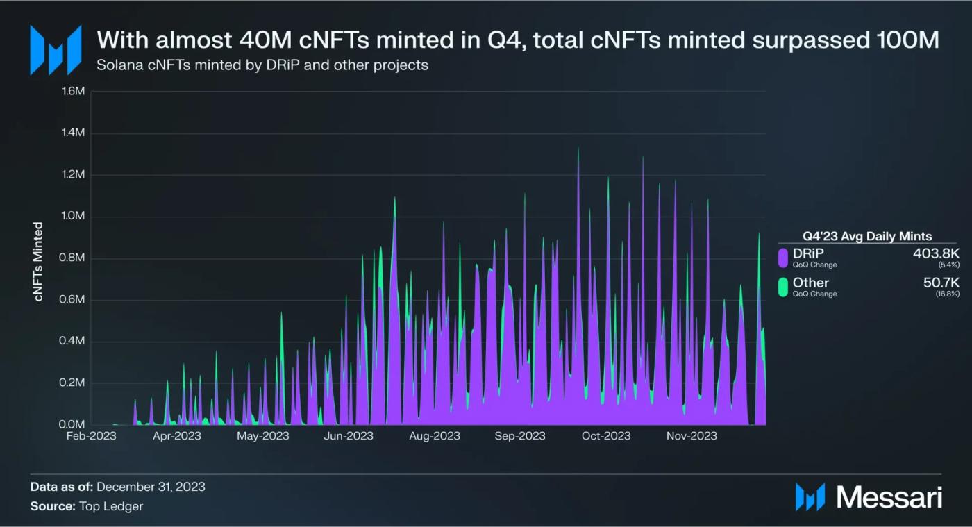 cNFT enables new use cases across consumer, DePIN and other areas, with DRiP being the most important example of a consumer application that can only be enabled with cNFT. DRiP cooperates with artists to provide NFT art coins for free, and the collection size is much larger than the normal 10,000. DRiP minted more than 35 million cNFTs in the fourth quarter of 2023, with an additional 4 million minted by Dialect, Helium, and other projects.