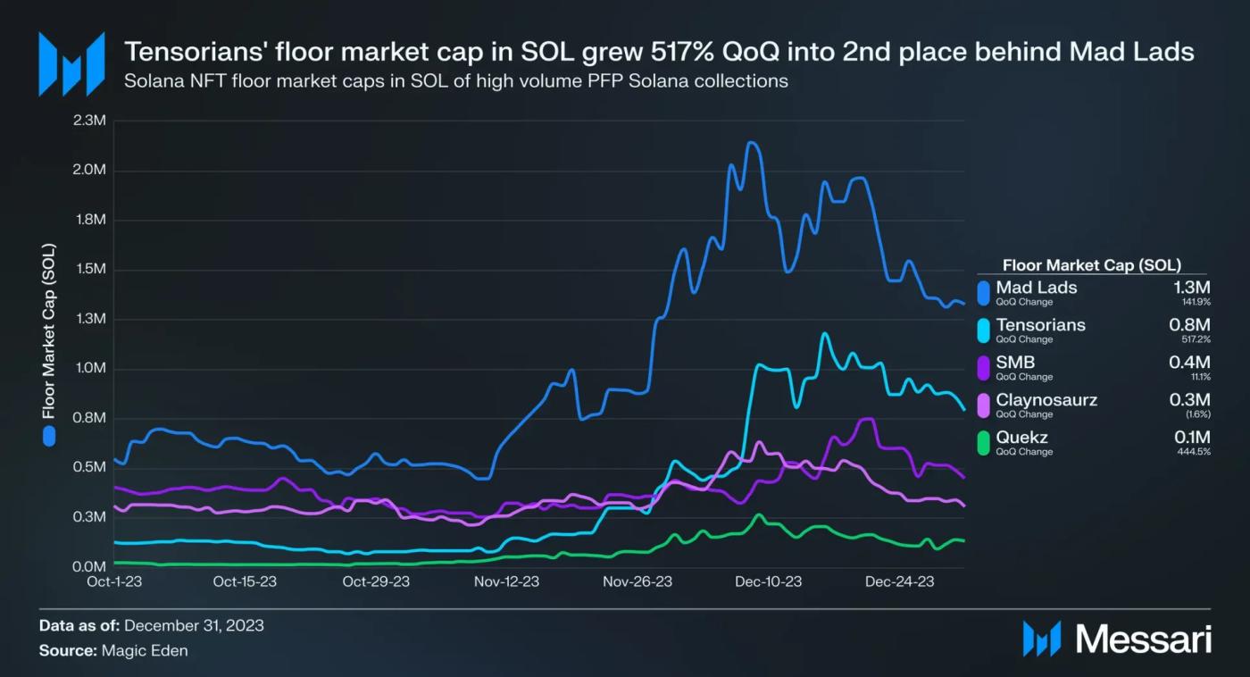The series with the highest total transaction volume in the fourth quarter of 2023 include Mad Lads (613,000 SOL), Tensorians (510,000 SOL), and Claynosaurz (171,000 SOL). These NFT series all represent the transformation of PFP NFTs into brand building and practical applications.