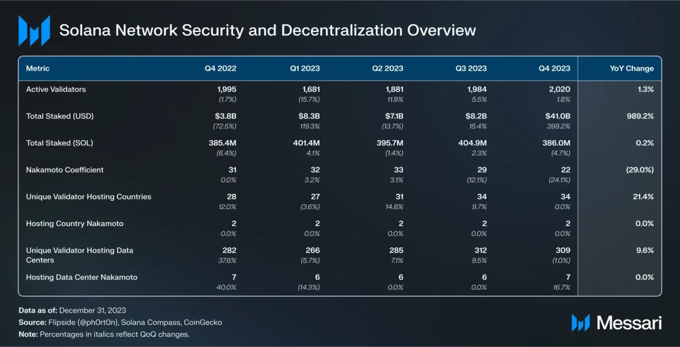 Solana validators are hosted in 309 unique data centers, a year-on-year increase of 10%, and Solana's current data center Nakamoto coefficient is 7.