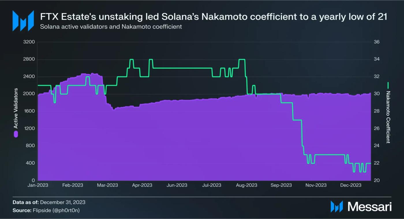 The unstaking of FTX Estate hurts Solana’s Satoshi coefficient because Alameda/FTX was previously staked to a wide range of validators. As of this writing, Solana’s Nakamoto coefficient is 22, the lowest in more than a year, but still higher than the median of other networks.
