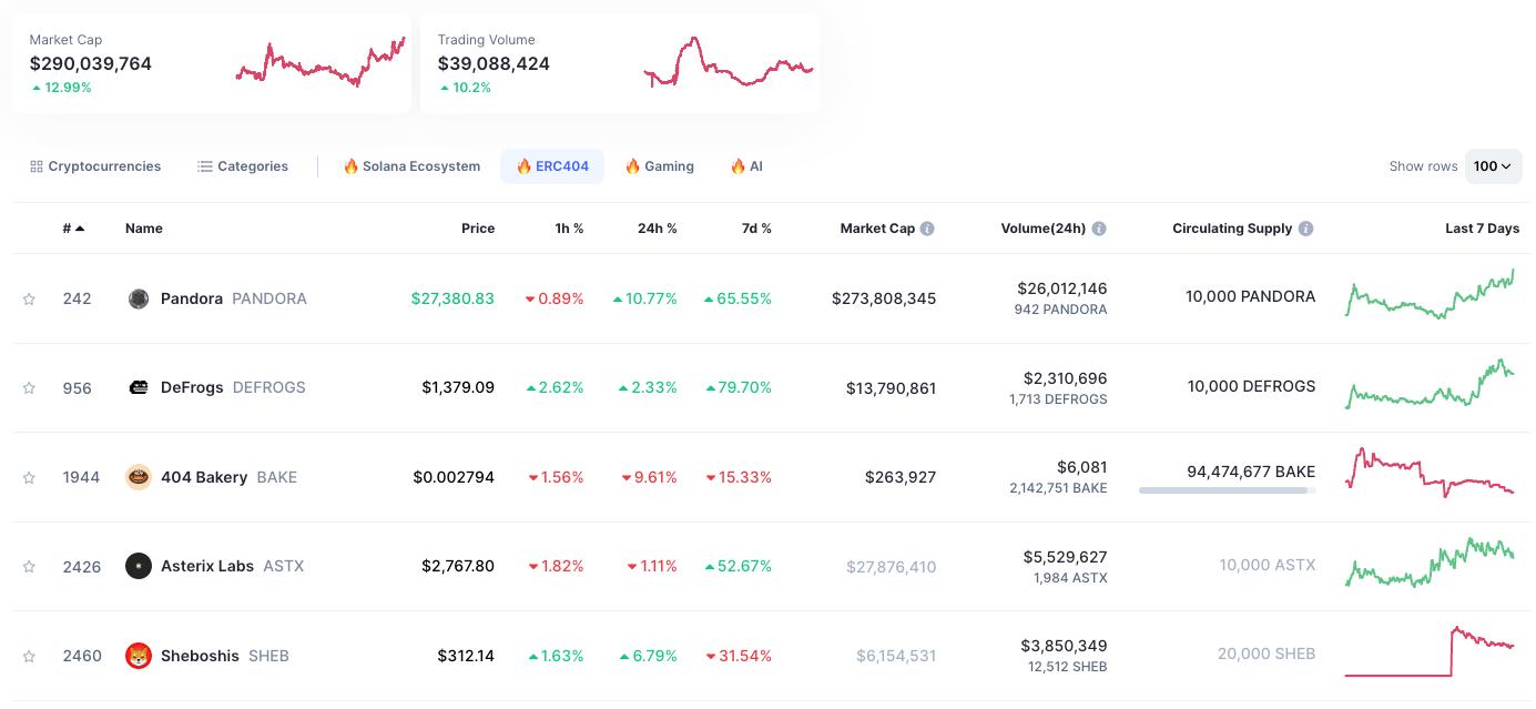 A prominent project in the ERC404 arena is Pandora, boasting a market capitalization exceeding $246 million. Noteworthy projects such as Anon, DeFrogs, and others are in high regard.