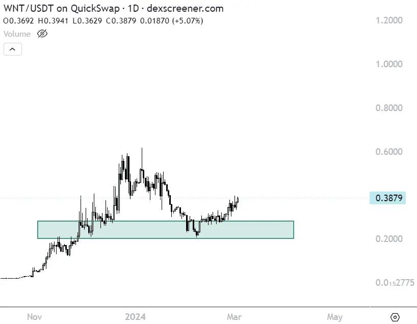 WNT is currently priced at $0.38 and has a market capitalization of $15 million.