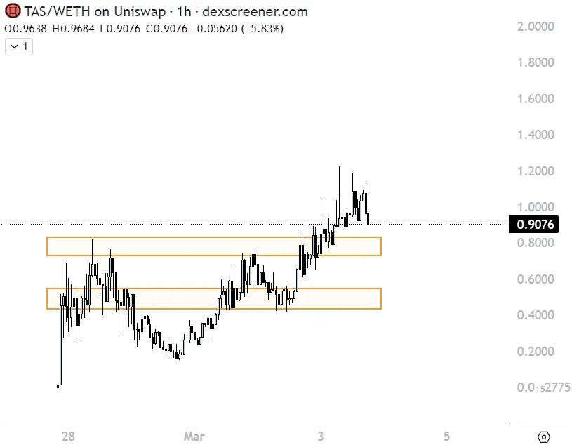 $TAS is currently priced at $0.9 and has a market capitalization of $9 million.