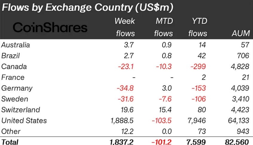 CoinShares: Digital asset ETP saw a net inflow of US$1.84 billion last week, with trading volume hitting a new high of over US$30 billion