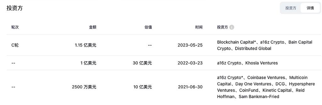 Investment institutions include top VCs such as a16z Crypto, Coinbase Ventures, Multicoin Capital, and Blockchain Capital.