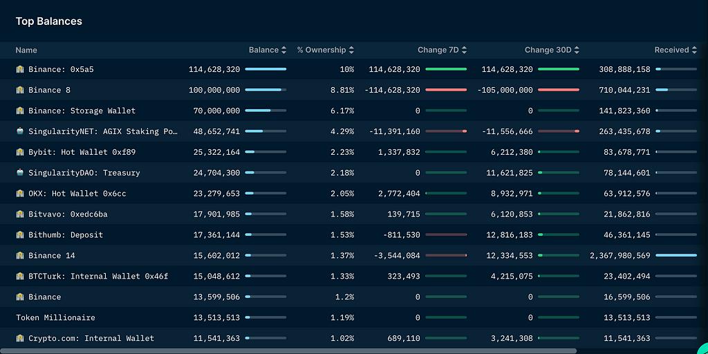 The current market value of AGIX is 1.747 billion, FDV is 2.738 billion, the maximum supply is 2 billion, and the current circulation is 63.84%. The main trading markets are Binance, OKX, and Bybit. More than 27.55% of the tokens are accumulated in Binance, and the exchanges have accumulated about 40% in total. The project party holds 6.5% of the tokens. The top 20 largest currency holders on the chain have a certain scale of seizing the wallets on the chain. Big sell off.