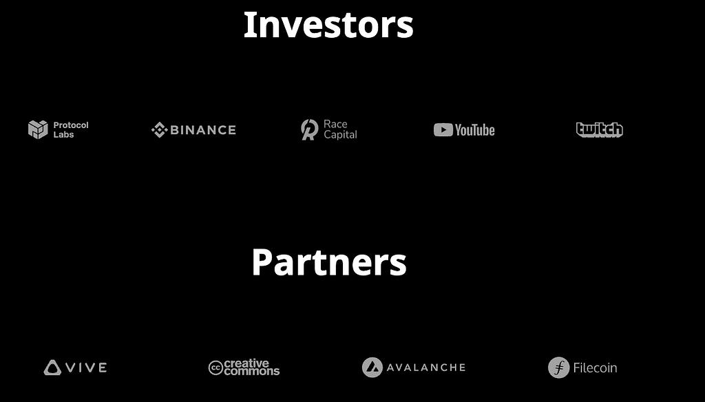 Investment institutions include Protocol Labs, Binance, Race Capital, YouTube, and twitch