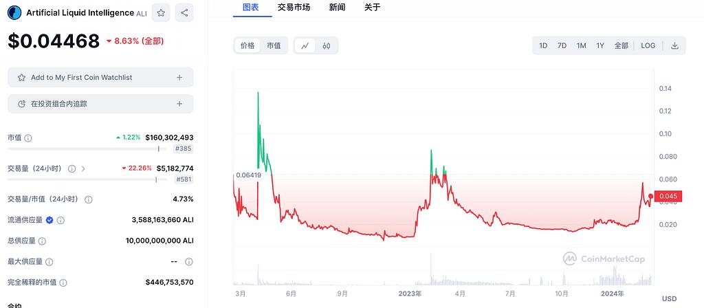 ALI's current market capitalization is 160 million, FDV is 446 million, the maximum token supply is 10 billion, and the current circulation is 35.88%. The main trading venues are HTX, Gate, and Crypto.com, and it has the potential to further expand mainstream Dex.
