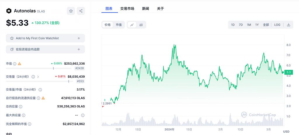 According to data previously disclosed by the project team, OLAS’ current market value is 253 million, FDV is 2.857 billion, and the current circulating supply is 47.61 million tokens. The main trading market is Uniswap, and Bitget has recently been launched. With its popularity and development, there are also Expectations for further listing of Dex. Previously, the token price was sluggish due to the problem of project parties selling tokens and centralized token operations. Recently, there have been new token pledge proposals. We remain optimistic about its fundamentals, but the actual operation and token chip structure still need to be continued. Follow up.