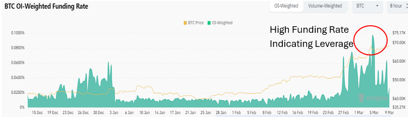 The funding rate peaked last Tuesday, leading to a large liquidation potentially due to high leverage, briefly pushing BTC's price down to $58,000. However, strong buying pressure quickly pushed the price back above $60,000. The funding rate has since come down toward the end of the week, indicating healthier leverage in the market.