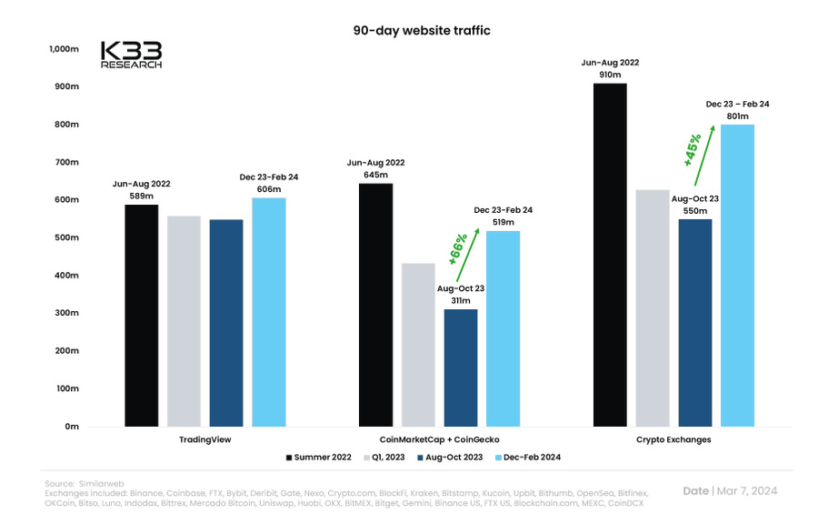 With strong buying pressure supporting BTC and ETH, and the macro environment continues to be supportive, we see the bull market momentum continue for crypto. Crypto website traffic has increased drastically this year, although still below the level seen at the last peak of the bull market. As BTC enters mainstream, we expect this bull cycle to be longer but also milder for BTC. Altcoins will behave like an elastic band tied to BTC, with higher up and downside based on their own narrative strength. We are likely in the first third inning of a bull market, so buckle up and enjoy the ride!