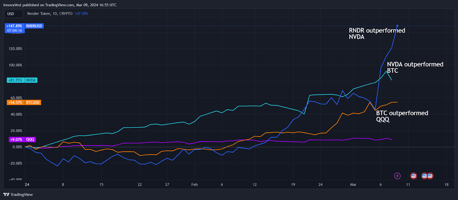 According to the same survey, TradFi manager’s allocation to Tech stocks has raised allocation to tech by 10 percentage points MoM to net 36% overweight. The main driver is the rise of AI, as firms like OpenAI and NVIDIA are enabling mass adoption. On a YTD basis, NVIDIA stock has outperformed BTC, while BTC outperformed the broad tech stock index QQQ. The crypto+AI sector has served as a high beta play on AI theme, with RNDR, the largest decentralized computing protocol by market cap, outperforming NVDA. The sentiment around AI is particularly strong heading into NVIDIA’s GTC conference. We expect more volatility in the AI sector as investors observe whether rising demand in AI would match NVIDIA”s increased production.