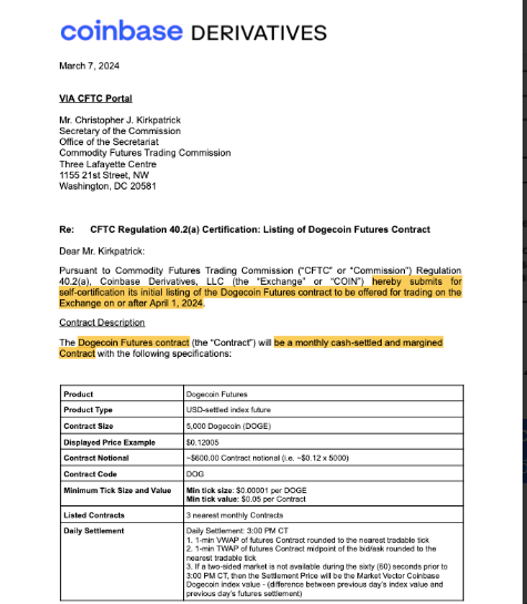 “Coinbase Derivative […] hereby applies to self-certify an initial listing of Dogecoin Futures Contract to be offered for trading on the Exchange on or after April 1, 2024, ” reads the letter regarding the Dogecoin futures product.