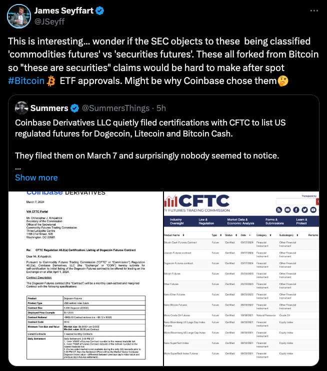 In a March 20 post to X, Bloomberg ETF analyst James Seyffart noted that the filings could be a strategic play to force the SEC to classify any Cryptoasset based on Proof-of-work consensus mechanism similar to Bitcoin. a “security.”