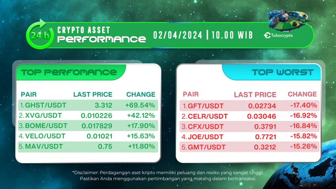Good morning Tokonauts 👨🚀, today $GHST saw a 69.54% increase, followed by $XVG with a 42.12% increase in the last 24 hours 📈 Trade #GHST and #XVG today on Tokocrypto! 👉🏻 tokocrypto.com/markets Note: The last price is in…