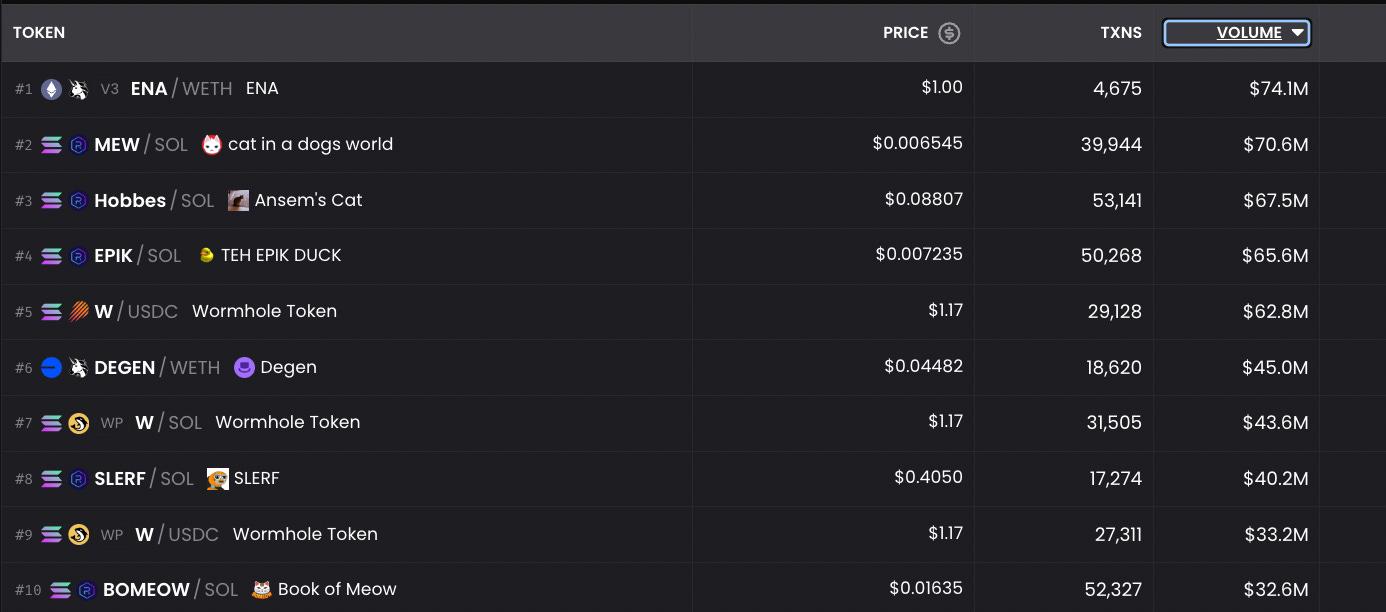 Memecoins Make Up A Large Part of The Top 10 Daily Traded Tokens (Source: Dexscreener)