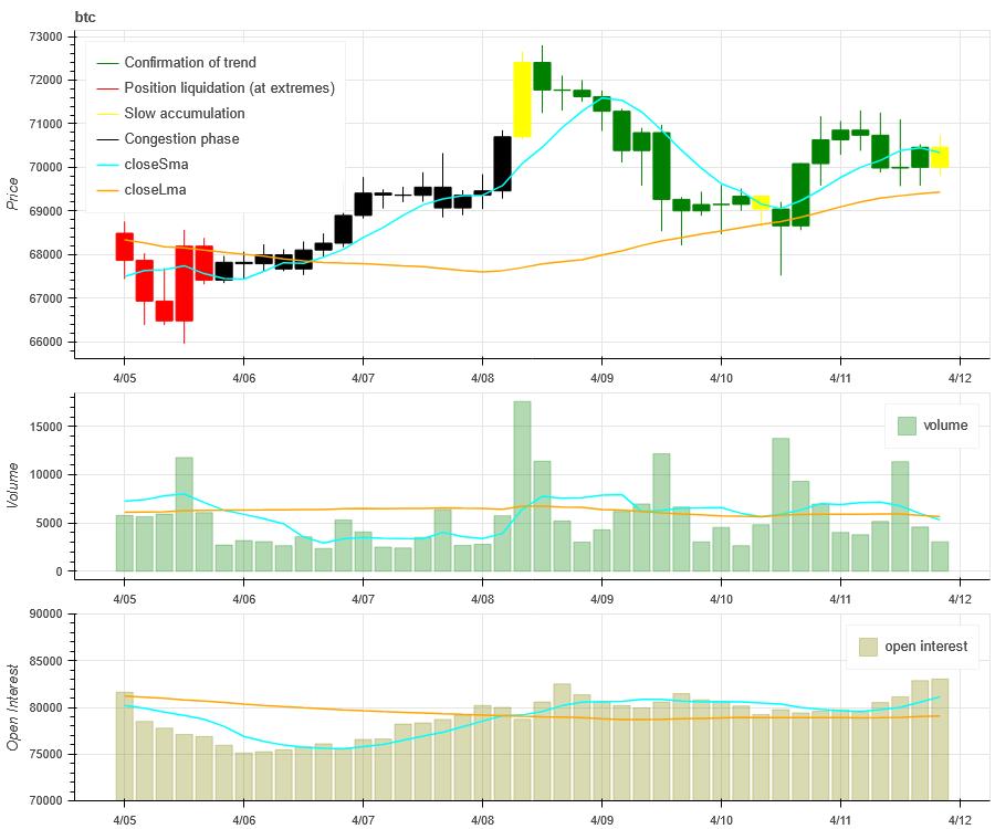 The top of the above picture shows the price trend of BTC, the middle shows the trading volume, the bottom shows the open interest, the light blue is the 1-day average, and the orange is the 7-day average. The color of the K-line represents the current state, green means the price rise is supported by the trading volume, red means closing positions, yellow means slowly accumulating positions, and black means crowded state.