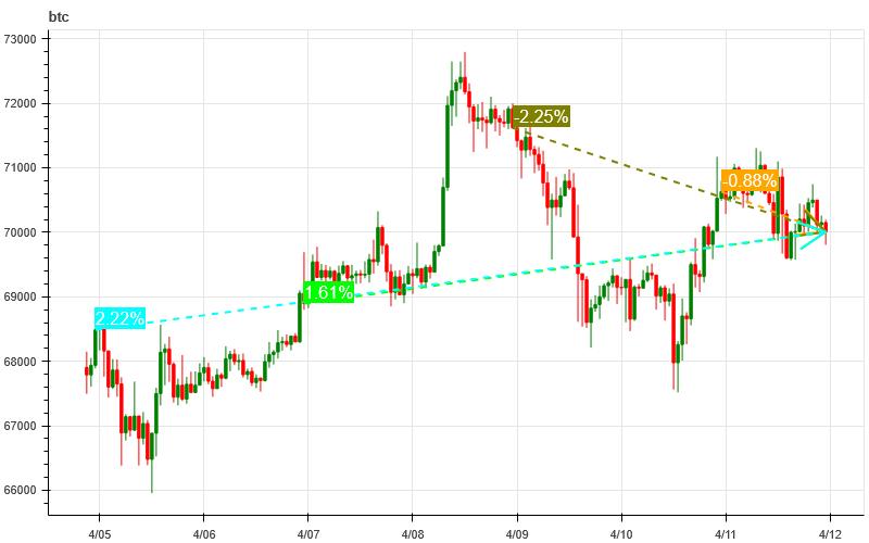 This week, on 2024.04.10 20:30 (Beijing time), the CPI value of 3.5% was higher than the expected 3.4%. After the data was released, Bitcoin fell slightly to a new low in the short term and then rebounded to a high of around US$71,500. The price generated a large turnover at US$68,000, forming a support level at this position in the short term. The current price is above the support, and we need to continue to observe whether the market has enough upward momentum.