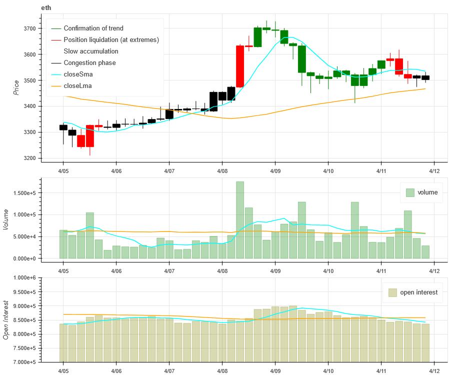 The top of the above picture shows the price trend of ETH, the middle is the trading volume, the bottom is the open interest, the light blue is the 1-day average, and the orange is the 7-day average. The color of the K-line represents the current state, green means the price rise is supported by the trading volume, red is closing positions, yellow is slowly accumulating positions, and black is crowded.