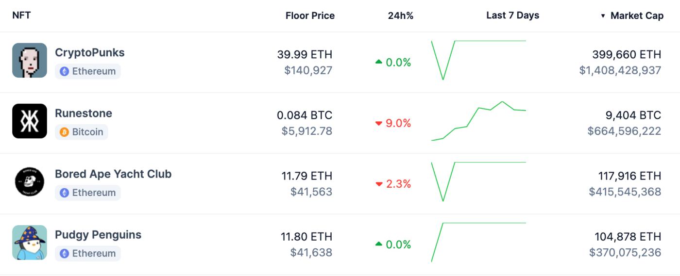 Data shows that the transaction volume of NFT on the Bitcoin chain ranked first in the past 7 days, followed by Ethereum and Solana, and the price of Bitcoin NFT also generally rose. Driven by the Runes protocol, the floor price of Runestone rose to 0.093 BTC (about 5,750 US dollars), and the market value reached 720 million US dollars, far exceeding BAYC to become the second largest project in the NFT market, although their positioning is different.
