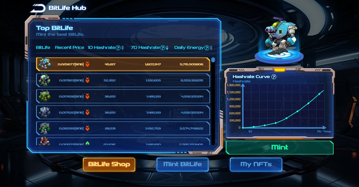 2. Mint "Bitlife", select Bitlife Hub-Bitlife Shop in the upper left corner, and choose a Bitlife with high computing power and ranking, but not very expensive, to mint. My personal method is to choose those that are ranked at the top but have recently declined in ranking (red arrow pointing downward). This is generally cheaper. If you are not good at research, it is not recommended to create Bitlife by yourself in the crafting table. Anyway, the computing power of my own combination is much worse than that of the ranking list 😂
