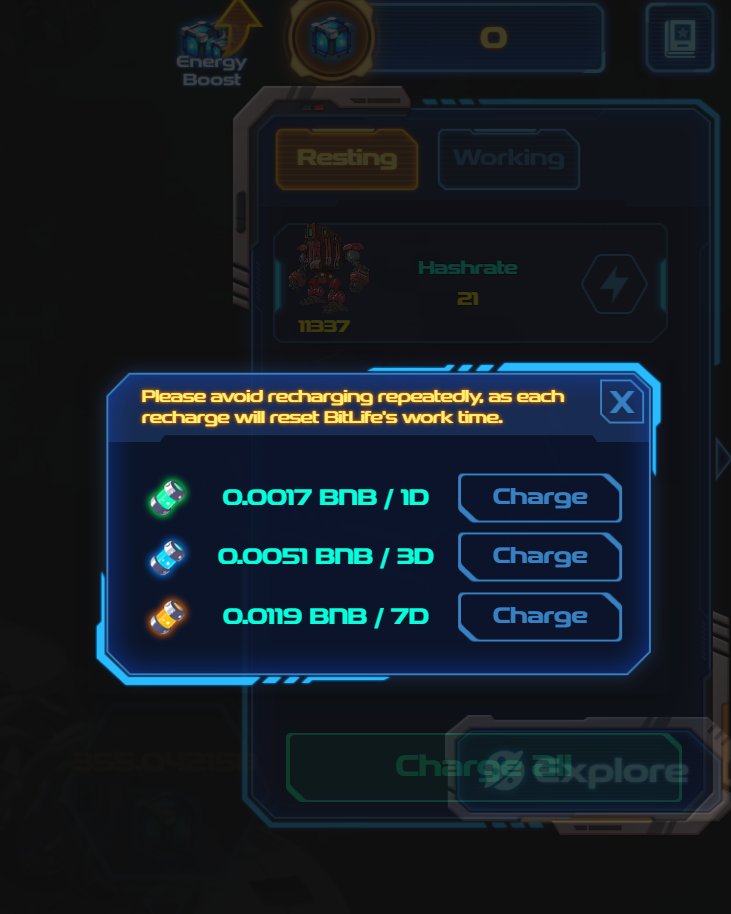 . Charge Bitlife, click the main base, you can see the Bitlife you just mined on the Resting interface, select it and choose to charge it, you can choose to charge for 1 day/3 days/7 days, and the cost required will increase proportionally. If you want to be lazy, you can directly choose to charge for 7 days