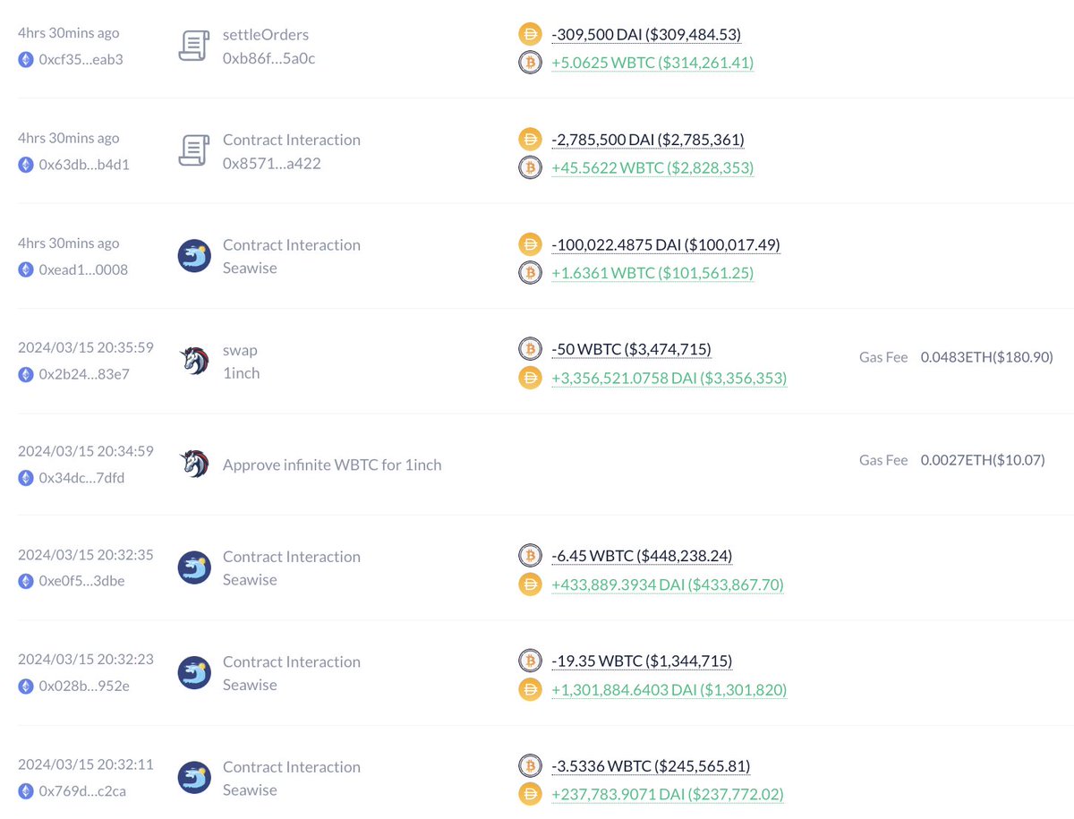 4/ On March 15, he sold 500 $WBTC for 33.64M $DAI at $67,283, making a profit of $16.78M.