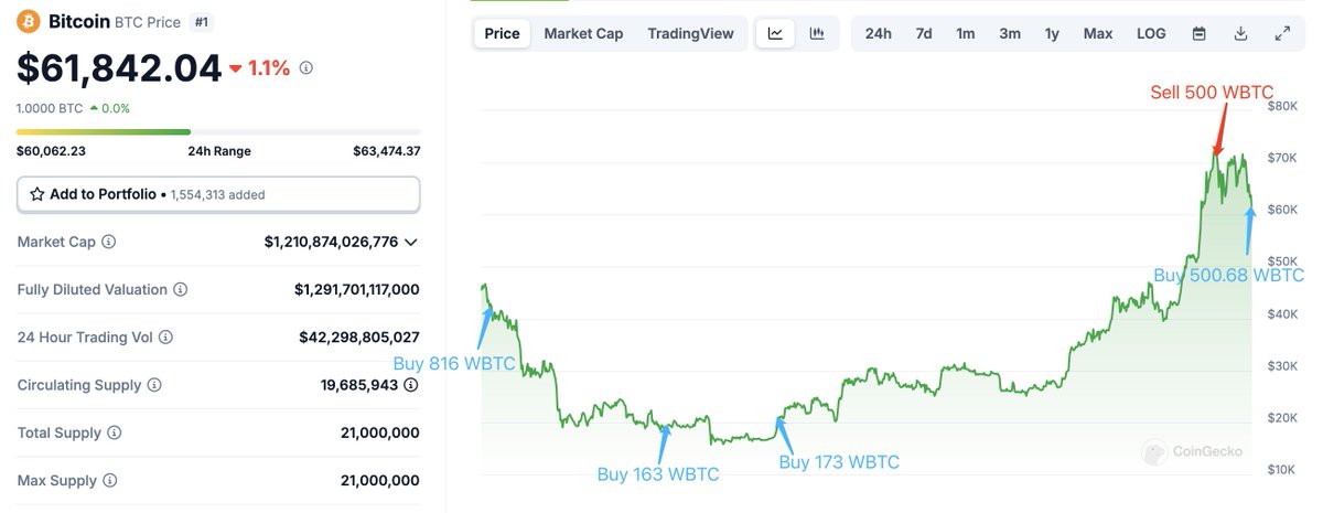 He currently holds 1,153 $WBTC($71.72M), with an unrealized profit of $35.7M.