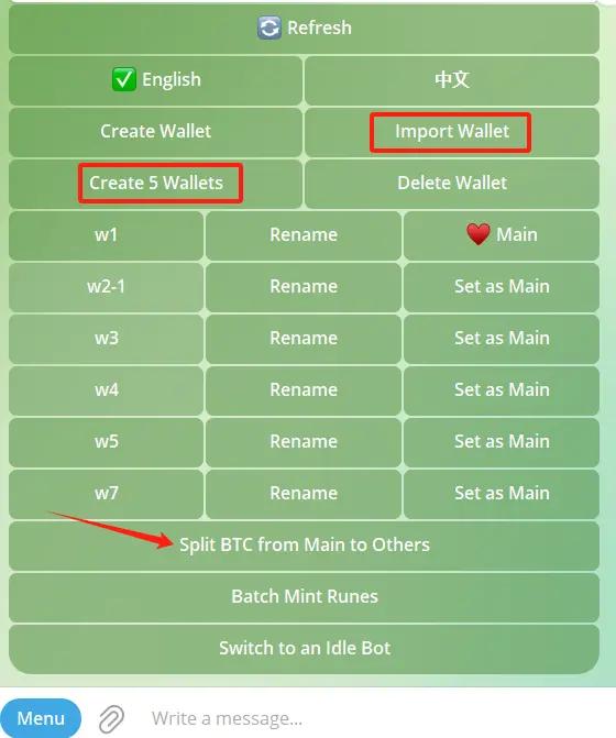 Click Menu in the lower left corner, click Wallets, click the "Create 5 Wallets" button or import an external wallet private key to create multiple wallets;