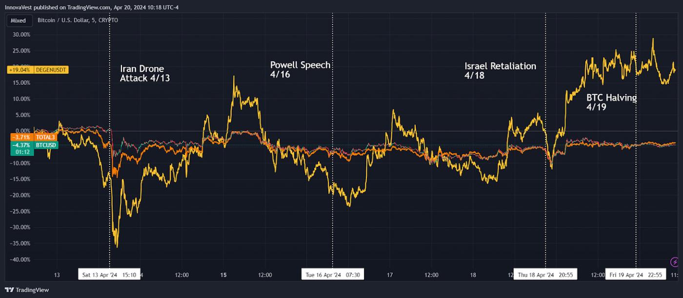 The crypto market underwent a significant stress test last week. When Iran launched the drone attack on Israel last Saturday, BTC immediately sold off 10% while the altcoin market sold off 15%. As the market recovered from the initial shock, Powell’s speech on 4/16 further dampened any expectation of rate cuts in the short term, which sent the market down again. The muted response after Israel’s retaliation attack on 4/18 seems to indicate a low probability of escalation of the geopolitical crisis. Overall, BTC ended the week selling off ~4.5% while the altcoin market fared a bit better, selling off 3.5%. What’s interesting is the price response for some of the high risk assets. For example, Degen, the top meme coin in the base ecosystem, has sold off ~35% after the drone attack but bounced back harder and ended the week up ~24%, indicating risk appetite exists in selected parts of the crypto market.