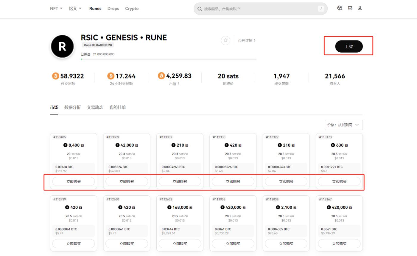 The secondary market trading of runes is similar to NFT trading, with floor prices arranged from low to high. For novice users, it should be noted that "purchasing" runes requires paying Gas to complete the chain, while "listing" orders does not require paying Gas.
