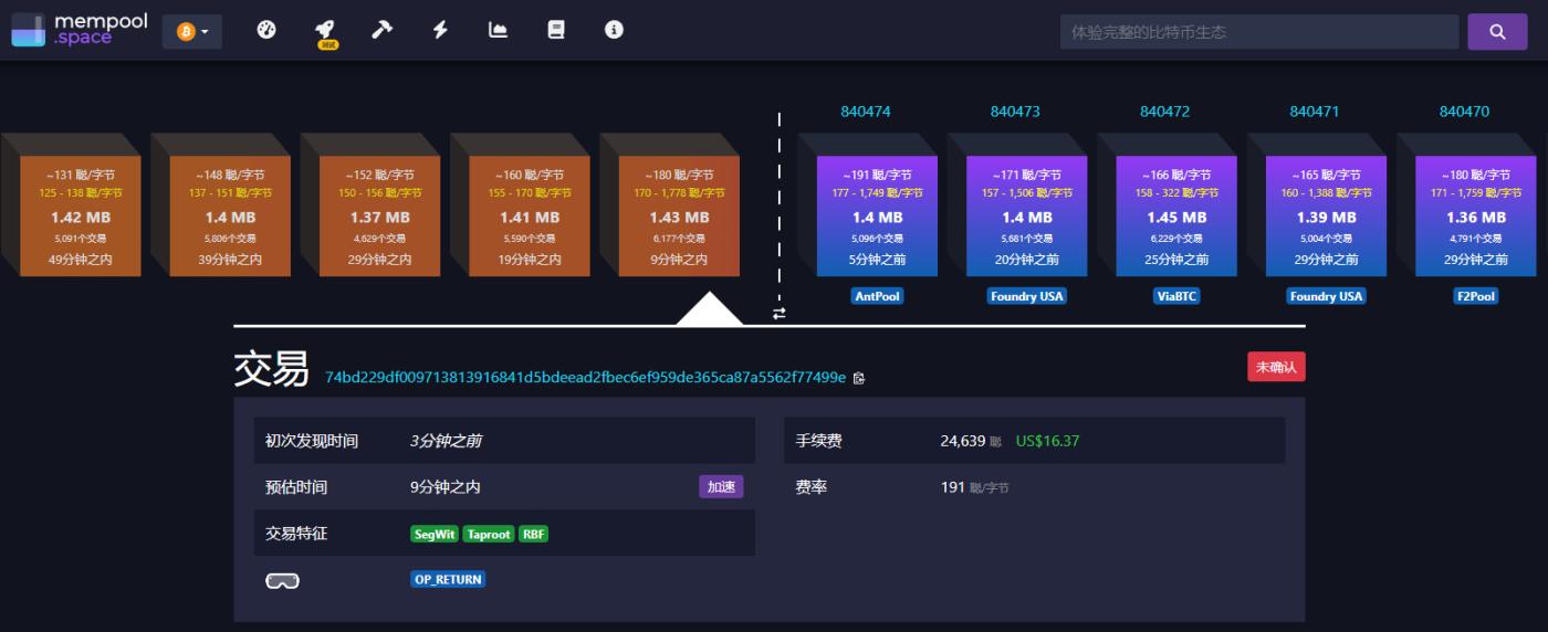On the other hand, check your wallet address and current transaction status. As shown in the figure below, the transaction is currently waiting to be uploaded to the chain, with a fee of 191 satoshis/byte and an estimated time of 9 minutes.