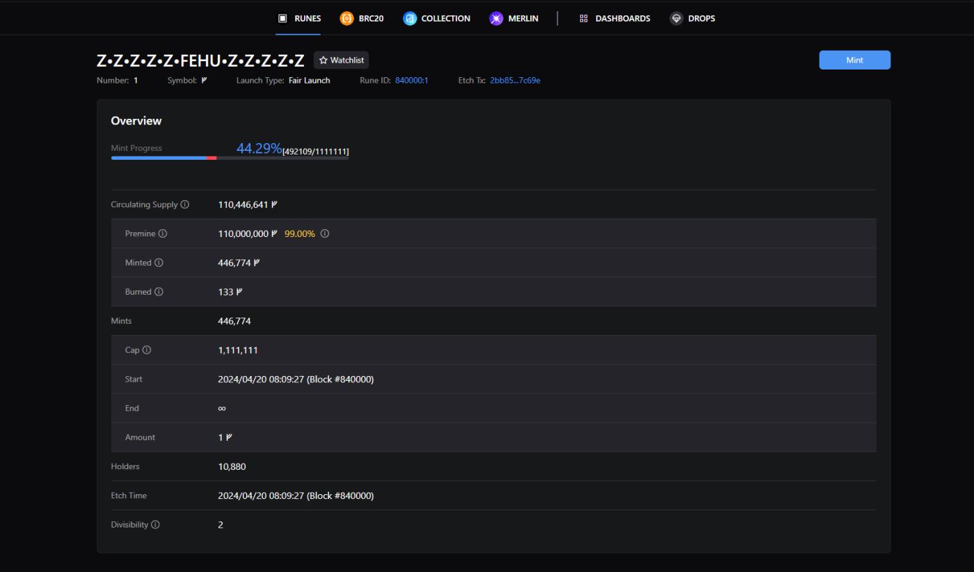 On the other hand, check the basic information of a BRC-20 project. Click the heat map to view the basic information of the corresponding project. As shown in the figure below, the minting time of the rune project Z•Z•Z•Z•Z•FEHU•Z•Z•Z•Z•Z started at 08:09:27 on April 20 (Block height is 840000), and the current minting rate is 44.24%. At the same time, in the lower half of the page, you can see the current position of the rune holder and other information.