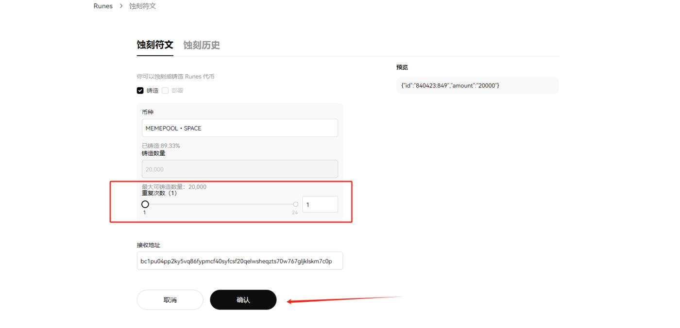 STEP 2. Select one of the rune projects. The picture below takes MEMEPOOL•SPACE as an example (for demonstration purposes only, not investment advice). Click "Mint Directly" and select the number of repetitions.