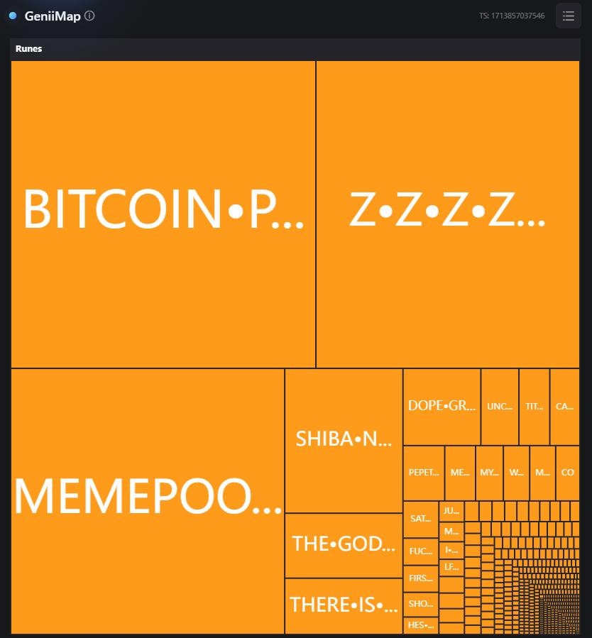 On the one hand, check the current popular projects on the BTC network. The heat map of the BRC-20 sector in the figure below is familiar to everyone. When casting inscriptions, you will see that various communities are issuing them. Through this heat map, you can know what the current popular projects are. As shown in the figure below, the larger the area occupied, the more transactions related to the rune in the previous trading pool, which means that many people are buying or trading the rune.