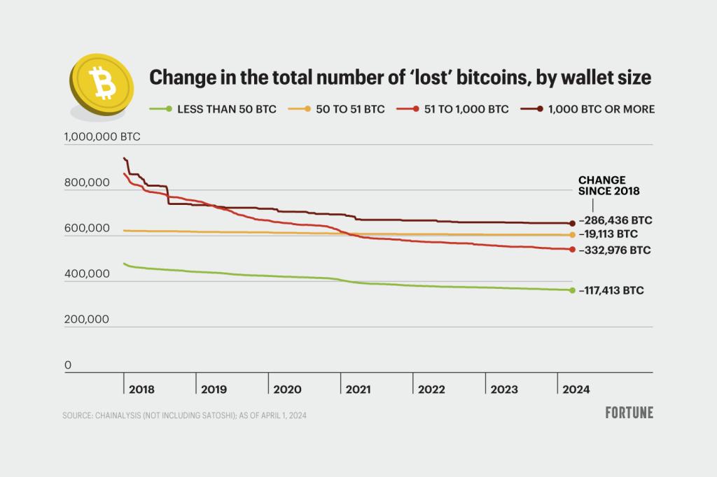 Chainalysis’s survey data suggests that old wallets will continue to be revived at a steady but slow rate until the number of lost bitcoins stabilizes: around 1.5 million.