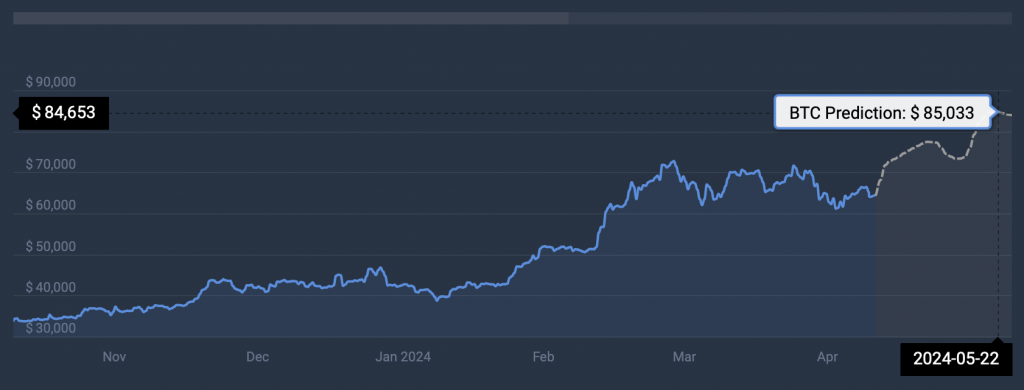 According to CoinCodex, Bitcoin (BTC) will hit a new all-time high of $74,172 on May 1, 2024. Moreover, the platform predicts BTC to continue its rally throughout May, hitting $85,033 on May 22, 2024.