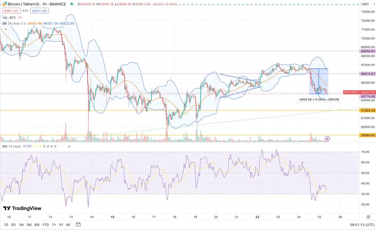Affected by a new round of geopolitical news in the Middle East, Bitcoin fell more than 4% during the day, reaching a low of 63,606 and forming a support level around 64,000.