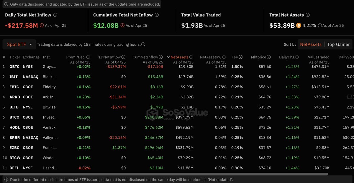 According to SoSoValue, the total net outflow from Bitcoin spot ETFs was $218 million yesterday. Grayscale ETF GBTC had a net outflow of $139 million, Fidelity ETF FBTC had a net outflow of $22.61 million, and Valkyrie ETF BRRR had a net outflow of $20.16 million, marking the first time that FBTC and BRRR experienced net outflows. Franklin ETF EZBC was the only Bitcoin spot ETF that saw a net inflow, with a daily net inflow of $1.8745 million. sosovalue.xyz/assets/etf