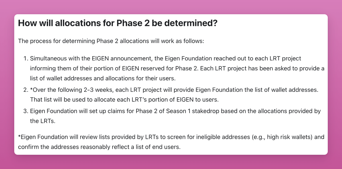 - Each LRT project will provide a list of wallet addresses within a 2-3 week period, which will be used for the EIGEN allocation.