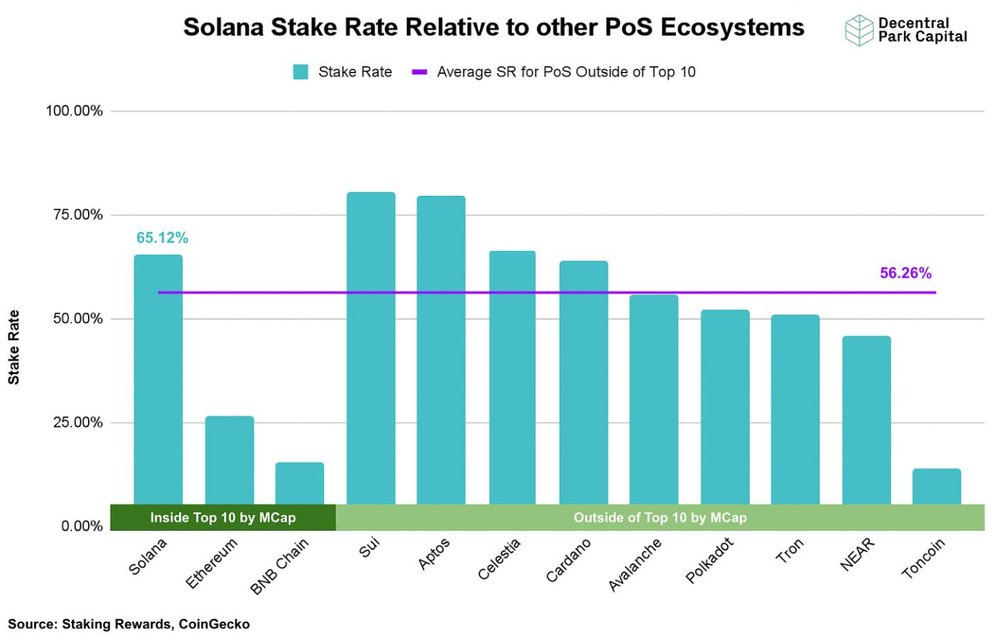 Solana boasts one of the highest staking reward rates amongst large Market Capitalisation (MCap) ecosystems at 7.31%. Unsurprisingly, this high reward rate has translated into a relatively high portion of SOL being staked. Solana’s stake rate, defined as the percentage of circulating tokens that have been staked, sits at 65.01%.