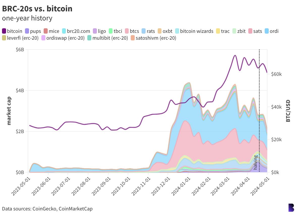 The most prominent BRC-20s have, however, been shedding market value ever since the halving, although it could be said they were trending downwards all year.