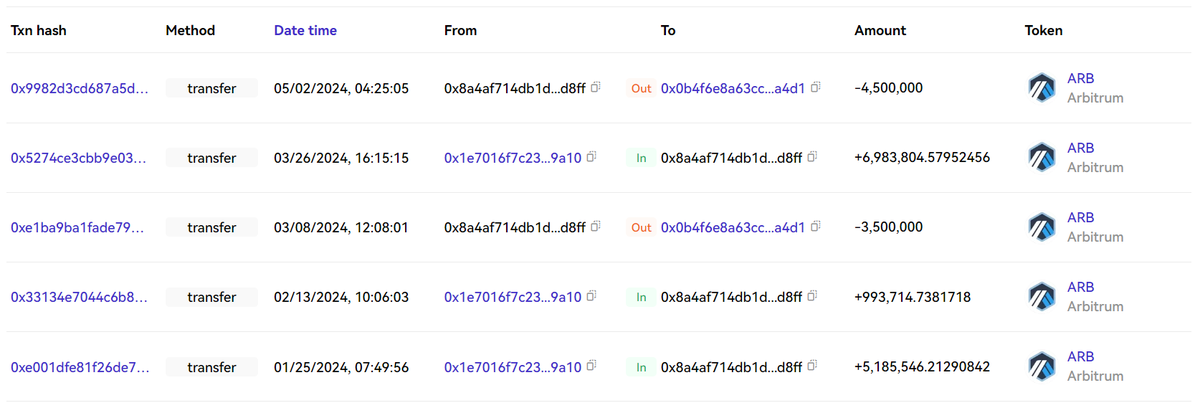 8 hours ago, a whale 0x8A4 transferred 4.5M $ARB (~$4.59M) to #Coinbase. A month ago, he accumulated those tokens at avg entry $1.74 and if sold at current price, his loss will be $3.24M (ROI -41%) His address: