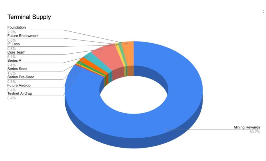 The Genesis Block will issue 42 million coins, accounting for 16.3% of the total supply, which includes foundation reservations, investors, teams, expected airdrop preparations, etc., and the remaining 83.7% of the supply will be mined through mining.