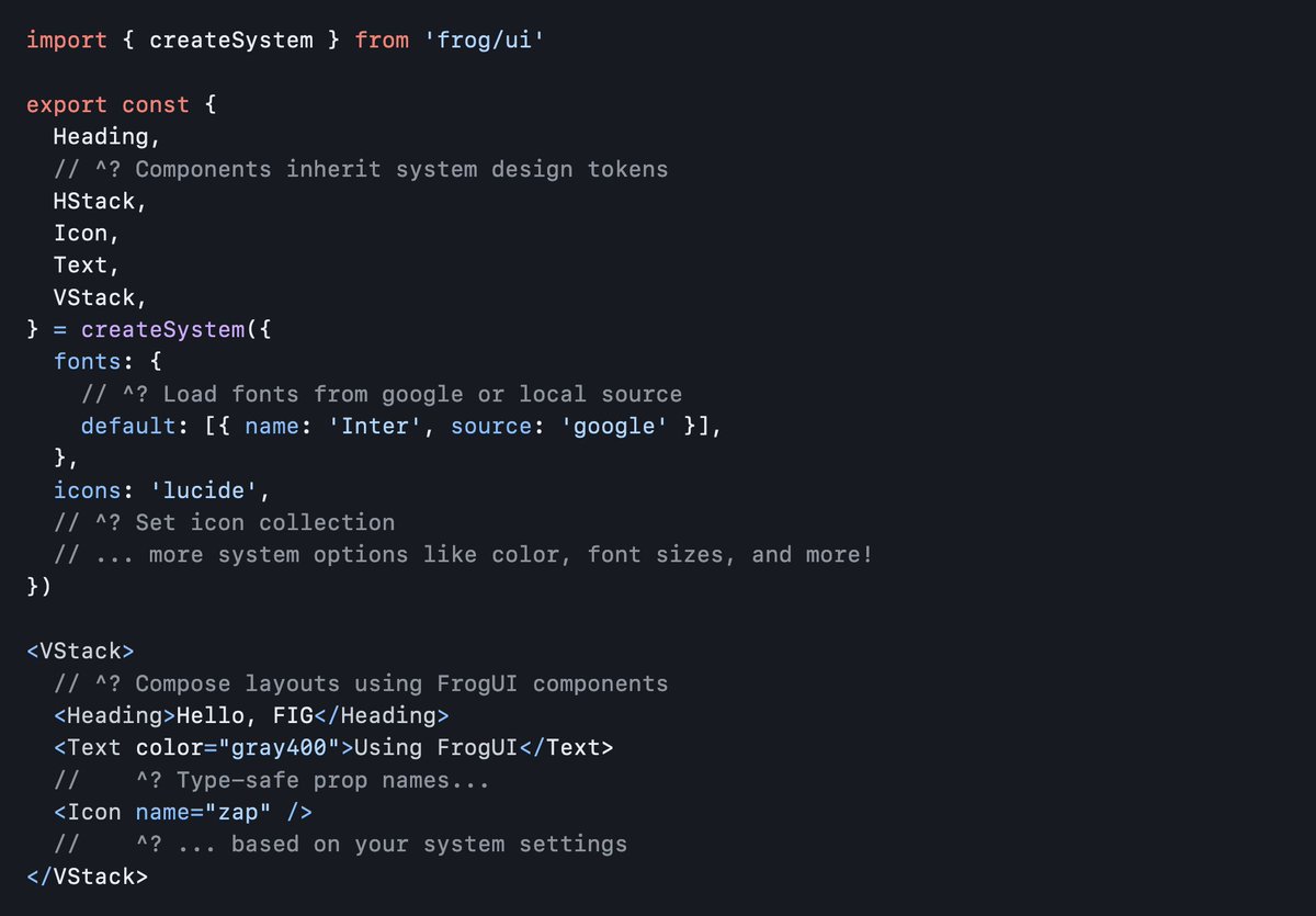 Frog makes it easy to follow the FIG through FrogUI frame primitives, familiar JSX components (SwiftUI-like) allowing you to rapidly compose layouts as well as manage color, icons, and typography in a systematic way.
