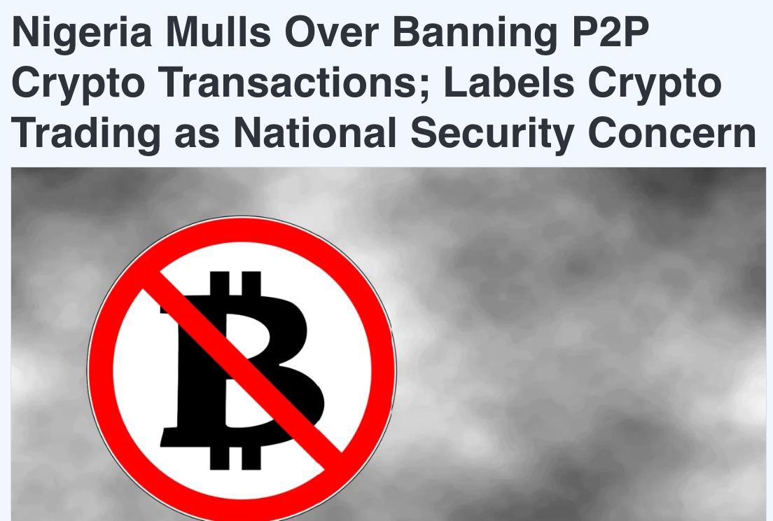 Nigeria is considering banning peer-to-peer (P2P) crypto trading due to national security concerns. At least three major fintech companies in Nigeria have begun blocking P2P-related accounts and reporting P2P transactions to law enforcement.